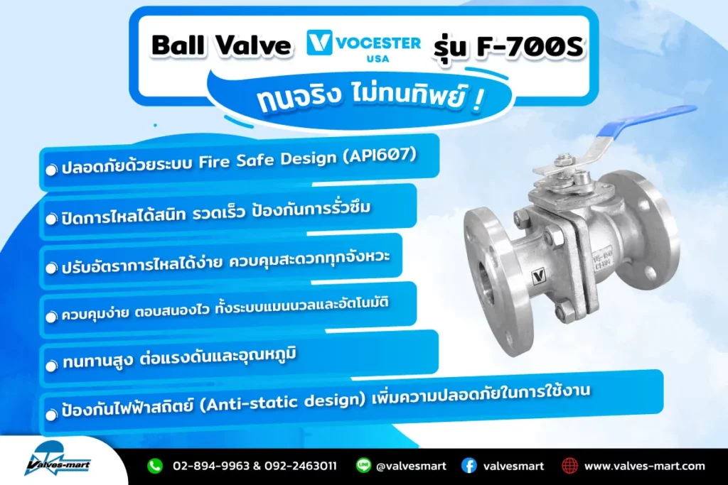 บอลวาล์ว Ball Valve Vocester รุ่น F-700S – ทนจริง ไม่ทนทิพย์! 02/12/2025 วาล์วคุณภาพสูงระดับอุตสาหกรรม มาตรฐาน Fire Safe Design API 607 (...) Read More